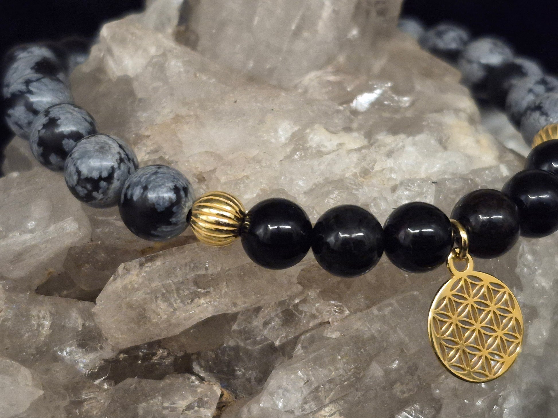 Energie der Geborgenheit – Handgemachtes Edelsteinarmband mit Schwarzem Turmalin, Schneeflockenobsidian & vergoldeter Blume des Lebens