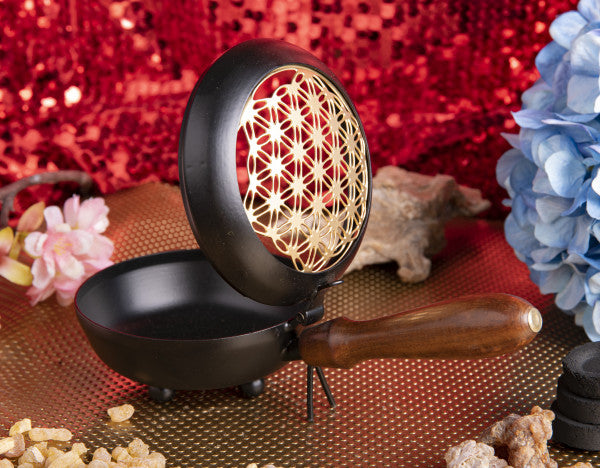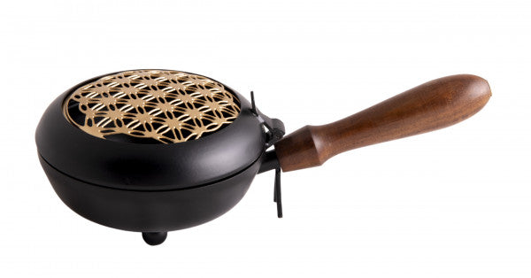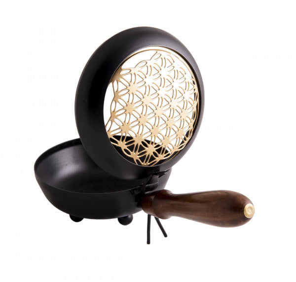 Dieses elegante Tragegefäß mit der symbolträchtigen Blume des Lebens schafft ein harmonisches Schwingungsfeld in Ihrem Zuhause. Der praktische Holzgriff ermöglicht müheloses Umhertragen durch alle Räume – ideal für Raum- und Aurareinigungen. Führen Sie sanfte Schwenkbewegungen von Raum zu Raum durch und reinigen Sie gezielt die Ecken. Bei Aurareinigungen umkreisen Sie die Person von unten nach oben mit leichten Bewegungen und lenken die Rauchfahnen bewusst zu. Gefertigt aus Eisen mit vergoldetem Deckel und stabilem Holzgriff. Maße: H 7,5 cm, L 23 cm, Ø 11,5 cm.